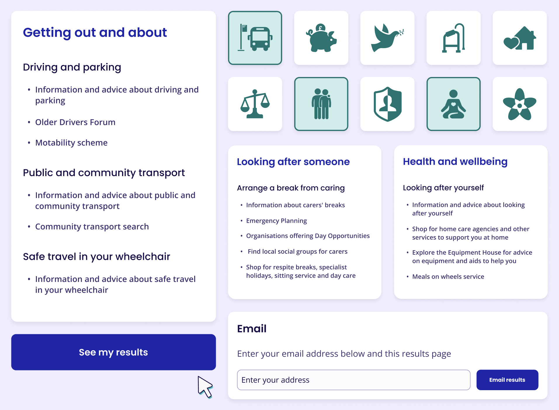 Users are then presented with a tailored results page featuring relevant links, resources, directory listings or external services, all aligned to their responses. Results can be emailed for future reference, and the tool can also be completed on someone’s behalf—making it ideal for local authority front door teams supporting residents over the phone or in person.
