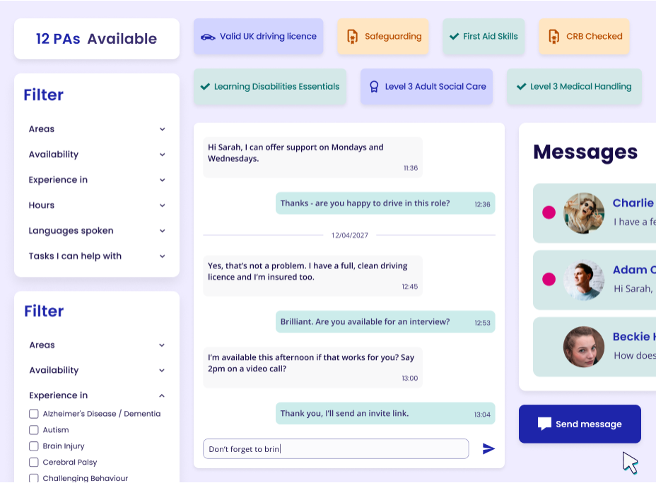 Our messaging system allows PAs and individuals to communicate via the website without having to share personal contact details
